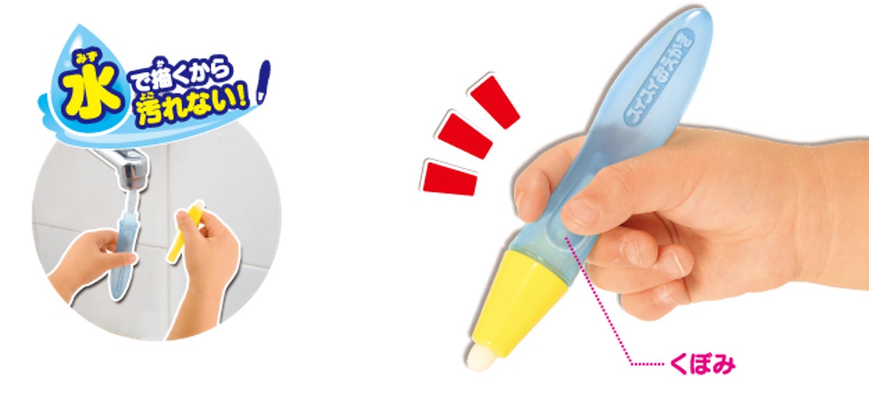 専用ペンは、名古屋市立大学の横山清子教授と共同研究で作り上げた流線形状のペンとなっており、人間工学に基づいた形状で、正しい持ち方でペンを握ったときに、持ちやすいよう軸にくぼみが付いています。くぼみに親指がくるように持って、繰り返し遊ぶことで自然に正しいペンの持ち方を身に付けることが出来ます。