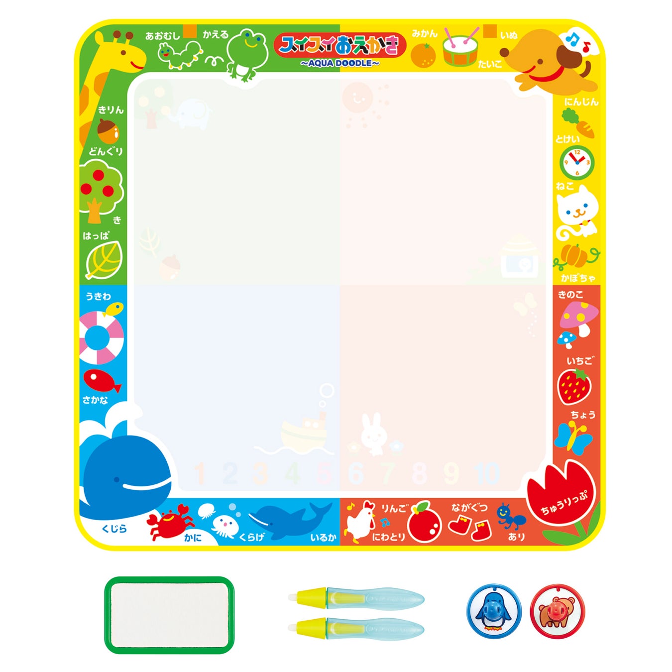 セット内容 :スイスイおえかきシート1枚、専用ペン2本、専用スタンプ2種、