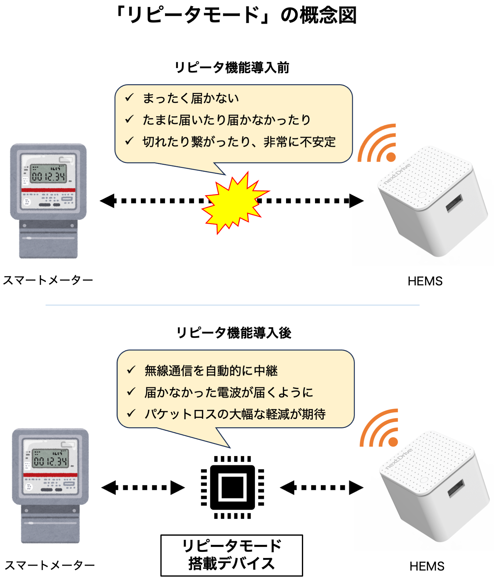 標準のWi-SUN Enhanced HAN規格では、リピータデバイスの中継は1回(2ホップ)のみとなっており、活用範囲が限定されていました。