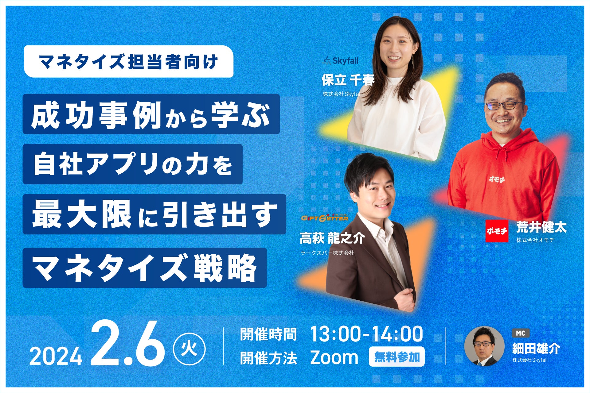 ユーザー体験に寄り添った広告マネタイズプラットフォーム『SKYFLAG』を運営する株式会社Skyfall(東京都港区、代表取締役社長:長谷川 智一、以下Skyfall)は、サービスを運営される企業様を対象に「“成功事例から学ぶ” 自社アプリの力を最大限に引き出すマネタイズ戦略」ウェビナーを2024年2月6日(火)に開催いたします。パネルディスカッションには、株式会社オモチ(本社:東京都台東区、代表取締役社長:荒井 健太)にて、ポイ活アプリ『ポモチ』の責任者を務める荒井 健太氏と、ラークスパー株式会社(本社:東京都豊島区)にて、ポイ活サイト『ギフトゲッター』の責任者を務める高萩 龍之介氏をお迎えし、アプリ収益最大化に向けた運用のコツをお話しいただきます。