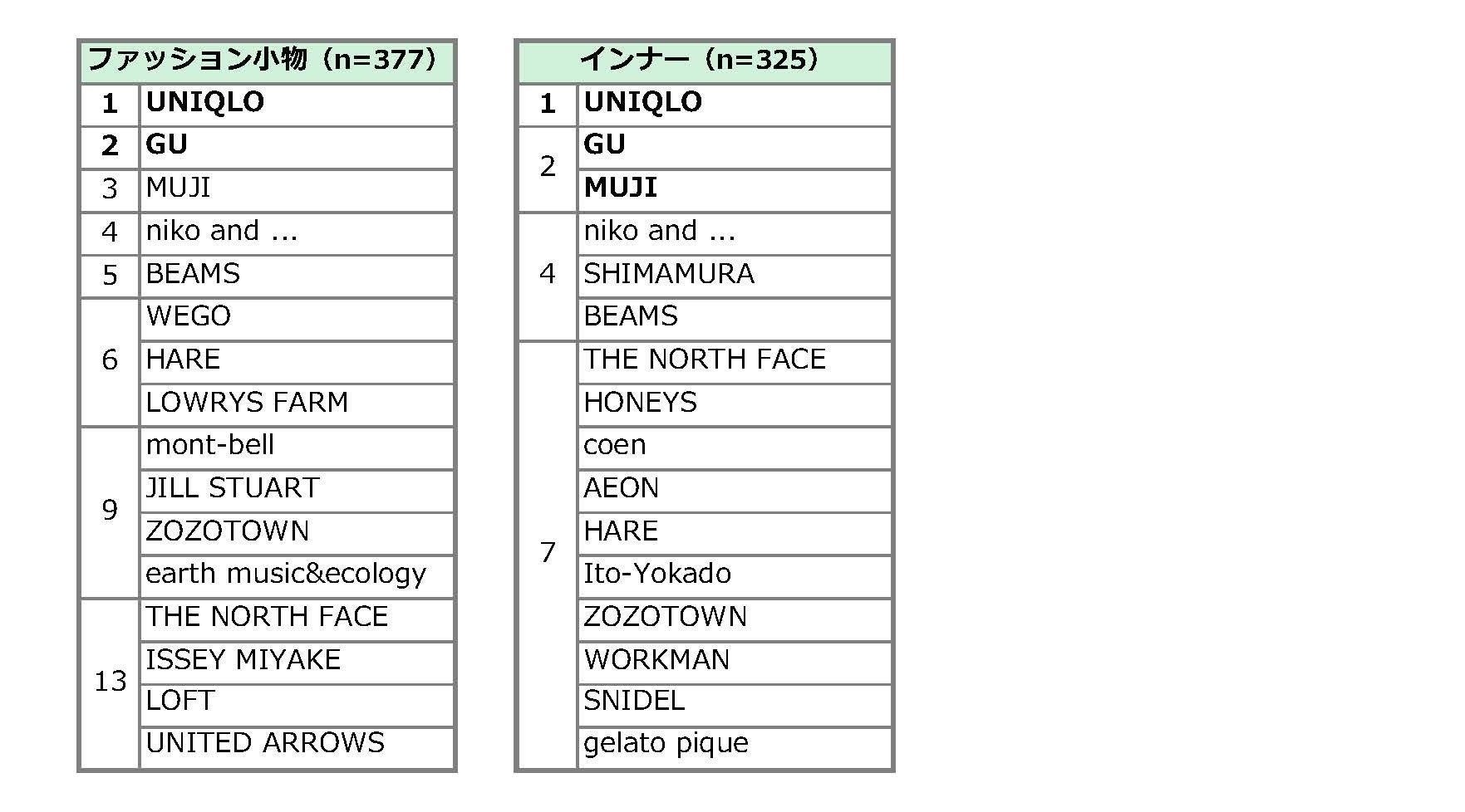 上記の質問で、日本で「アウター」「トップス・ボトムス・ワンピース」「シューズ」「ファッション小物」「インナー」をそれぞれ買いたいと答えた人に対し、具体的なブランドや店舗を聞きました。自由回答形式の記載を集計したところ、ユニクロが全5カテゴリーのうち「アウター」「トップス・ボトムス・ワンピース」「ファッション小物」「インナー」の4カテゴリーで1位を獲得しました。GUは同じ4カテゴリーで2位でした。