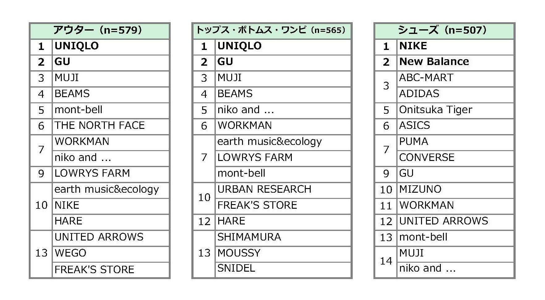 ・しまむらが「インナー」でニコアンドやBEAMSと同率4位、「トップス・ボトムス・ワンピース」でMOUSSYやSNIDELと同率の13位。