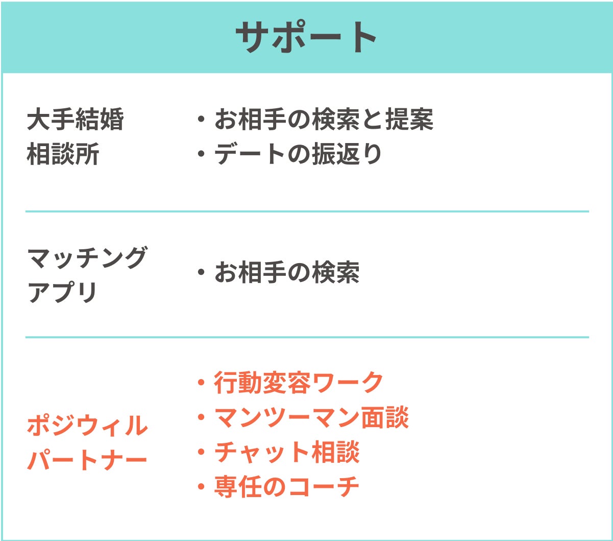 こうした悩みにお答えするため、ポジウィルは、お客様一人ひとりに向けた最適なパートナー探しをサポートするパーソナルコーチングサービスを開発しました。このサービスでは、結婚に対する具体的な基準作りからスタートし、パートナー探しの行動伴走においても密にサポートしていくことを目的としています。これまで既に数十名の方に対してパートナーに関するご支援をしてきた実績やノウハウをもとに、新サービスとしてこの度正式にスタートいたします。