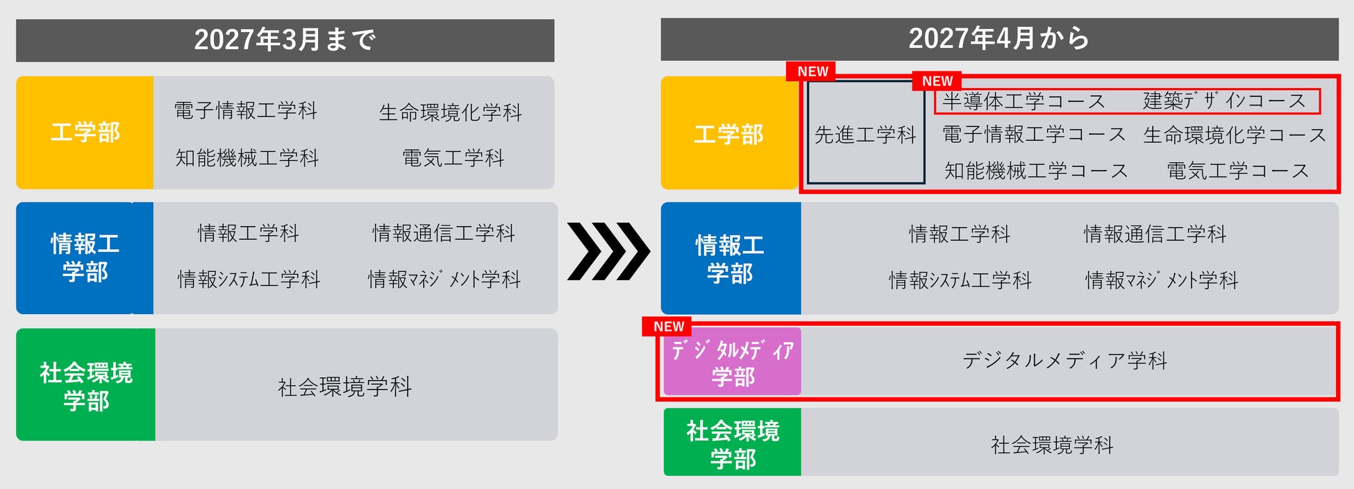 新学科では、従来の4つの学問分野(電子情報工学、生命環境化学、知能機械工学、電気工学)に加え、地域ニーズの高い「半導体工学」と「建築デザイン」を新設し、計6コースを設置する予定です。