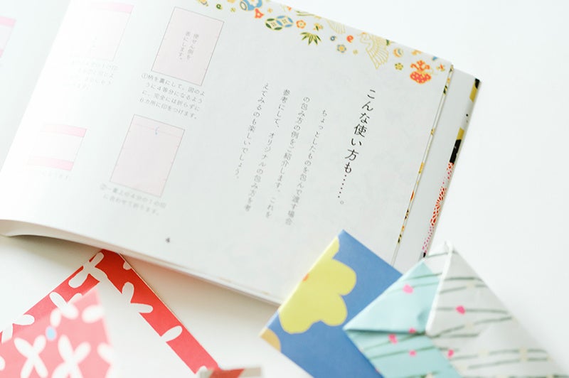 表には文字が書きやすいように、縦や横の罫線が入っていますが、裏面は全面カラフルなSOU・SOU のデザイン。この贅沢な裏面を生かして、お金や借りたものなどちょっとしたものを包んで渡す場合の包み方の例も読み物として紹介しています。