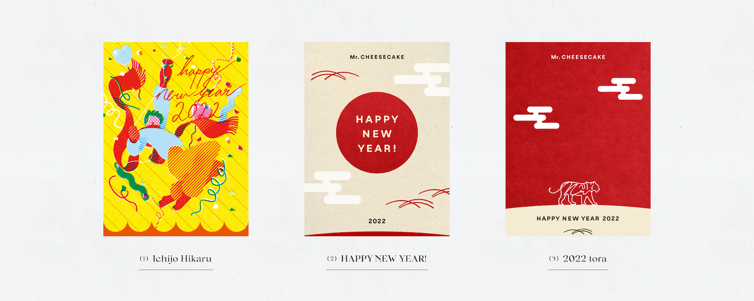 Scene by Mr. CHEESECAKEの第2弾は、新年の晴れやかな気分をぐっと盛り上げる一乗ひかる氏とのコラボレーションデザインの他、初日の出や2022年の干支である寅をモチーフにしたMr. CHEESECAKEのオリジナルデザインなど、3つのイラストから好きなデザインをお選びいただけます。
