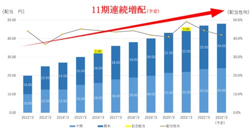 前期である2022年3月期は中間配当、期末配当ともに23.50円を支払い合計47.00円でしたが、今期はこれを更に1.00円上回る48.00円とし、11期連続の増配を予定しています。