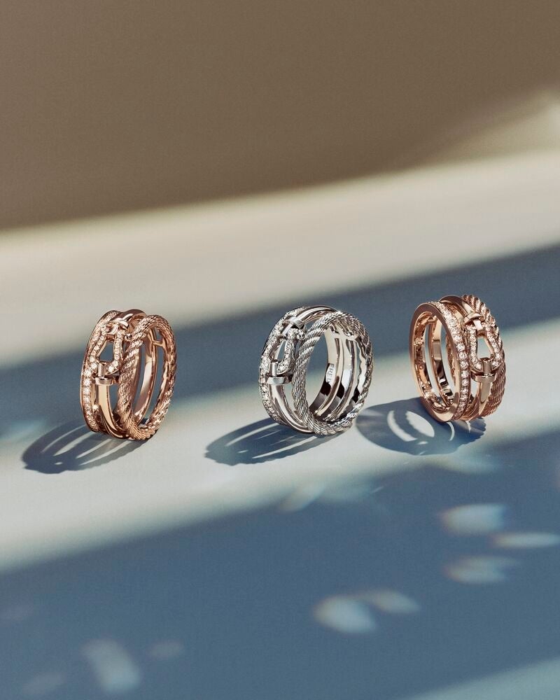 メゾンのシグネチャーであるフォース10のハイジュエリー作品の美学にインスパイアされ、真のスタイルのマニフェストが誕生しました。フォース10の象徴的なケーブルとバックルの力強く主張しあうコードの組み合わせと、ダイヤモンドのラインという、有機的なフォルムと直線的なフォルムが繊細に絡み合い、3列のピンクゴールドまたはホワイトゴールドが完璧なハーモニーを奏でます。
