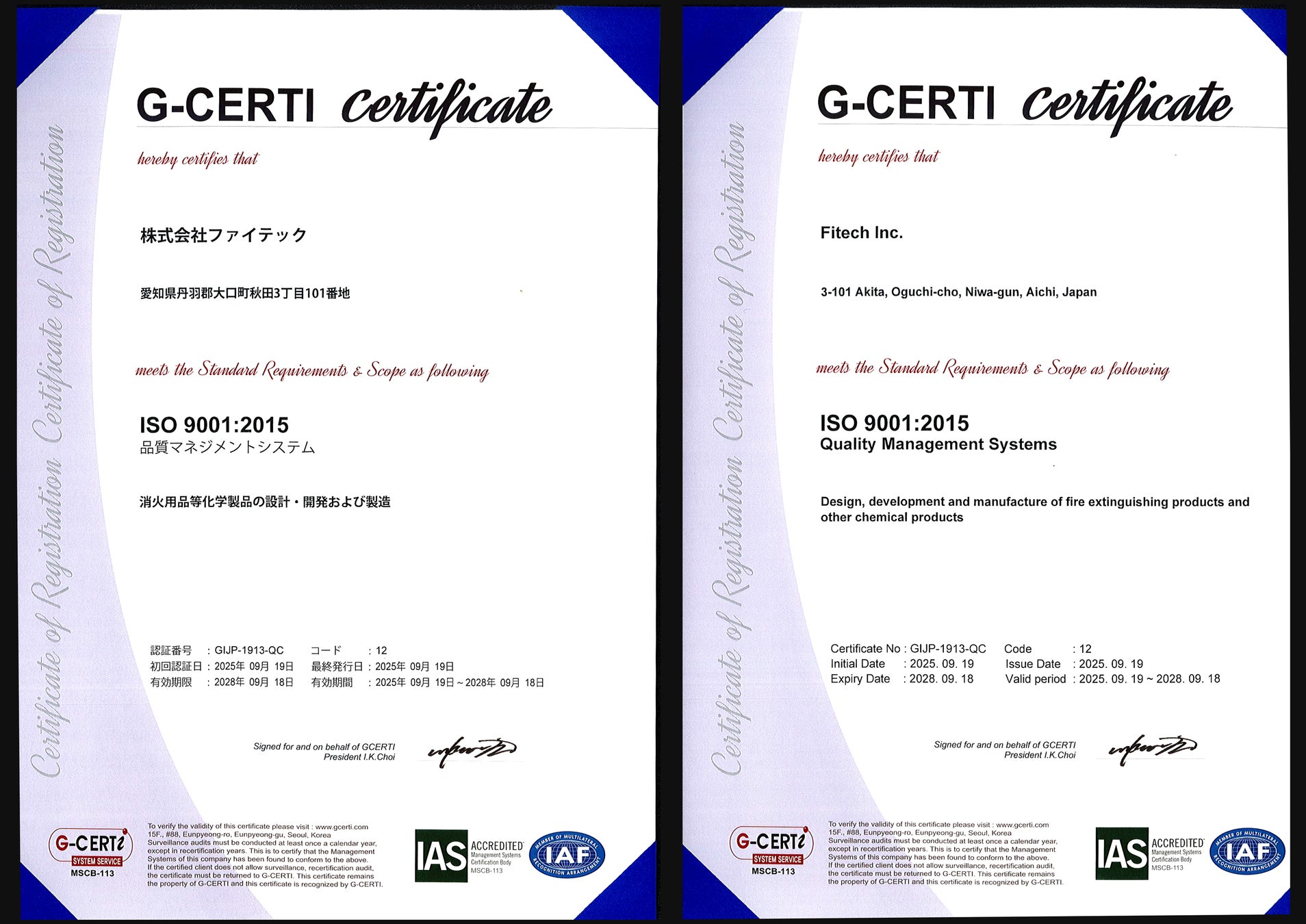 2025年9月19日、消火・防災製品の製造販売を行う株式会社ファイテック(本社:愛知県丹羽郡大口町、代表取締役:林 富徳)は、品質マネジメントシステムの国際規格であるISO 9001:2015の認証を、株式会社GCERTI-JAPANより取得いたしました。