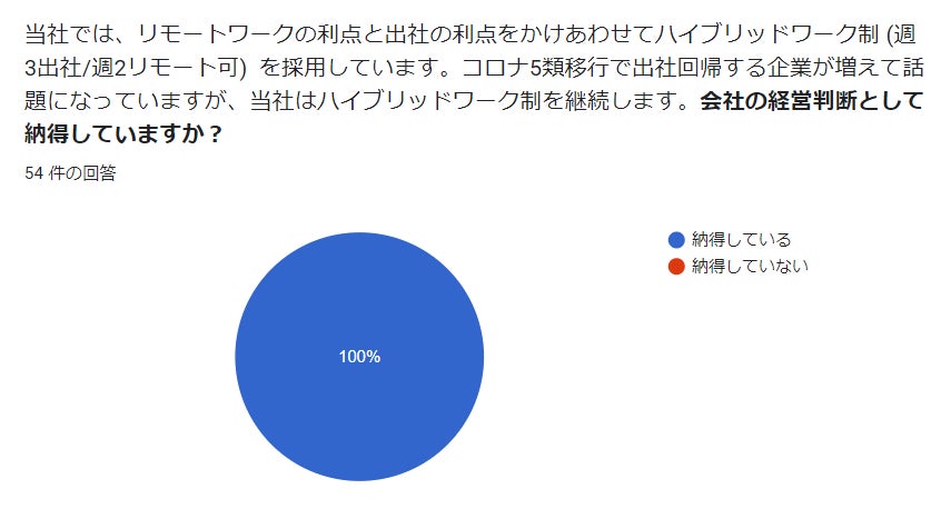 アンケート結果では、ハイブリットワークを継続するとした会社の経営判断について「納得している」と答えた従業員が100%でした。その主な理由としては、リモートワークと出社それぞれの利点を従業員が理解しており、チームや会社単位で仕事をする観点で、それらのバランスを取ることができるハイブリッドワークに合理性を感じているといったものでした。