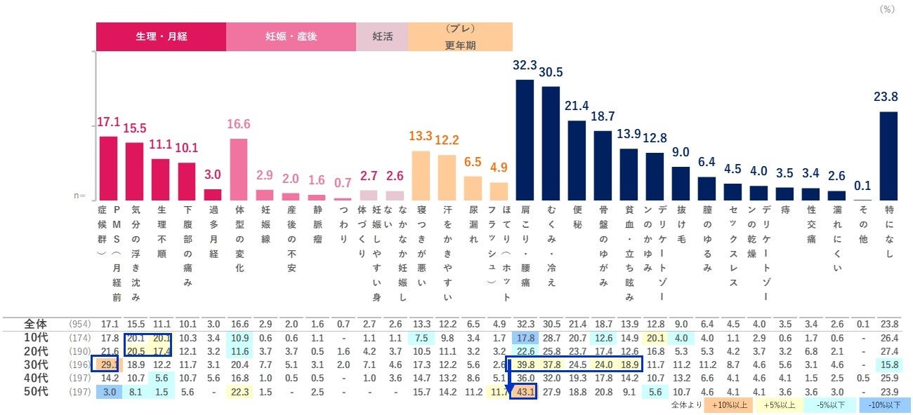 年代別では、「肩こり・腰痛」は50代が43.1%と最も多く、年代が上がるにつれて増える悩みとなっています。「気分の浮き沈み」「生理不順」は10・20代で2割、「PMS」は30代で3割と生理・月経関連の悩みは若年層に多くなっています。30代では「肩こり・腰痛」「むくみ・冷え」「便秘」などが2〜4割となっており、悩みが増えやすいタイミングであると推察されます。