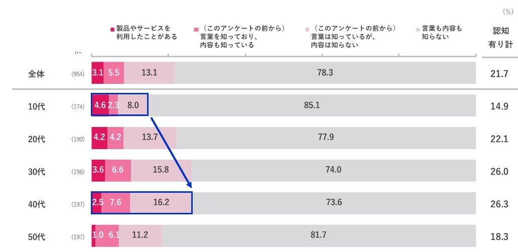 一方、40代の認知は最も高いが「言葉は知っているが、内容は知らない」が16.2%を占め、「製品やサービスを利用したことがある」は2.5%と低いです。