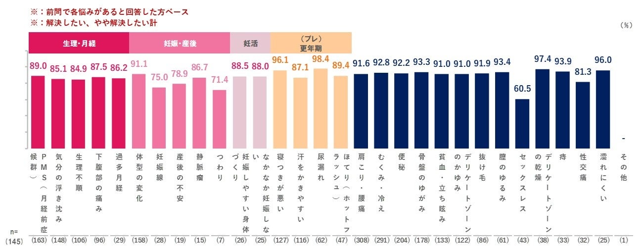 解決意向(T2B)はほぼ全ての悩みで7割以上で(「セックスレス」6割を除く)、ほぼ全ての人が高い解決意向を持っている。特に「尿漏れ」「デリケートゾーンの乾燥」「寝つきが悪い」「濡れにくい」は9割半ばを超え、その他にも9割を超える高い解決意向を持つ悩みが複数あがる。