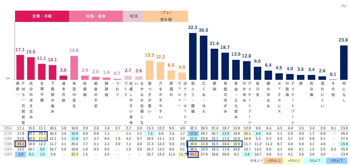 約8割の女性が何らかの悩みを持つ。特に「肩こり・腰痛」「むくみ・冷え」は3割を超える。「PMS」「気分の浮き沈み」「体型の変化」「便秘」「骨盤のゆがみ」も約2割あがる。