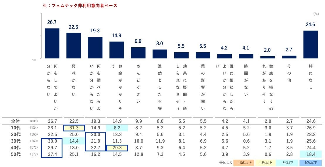 フェムテックの「利用意向あり(T2B)」は15.6%と2割にも満たず、「どちらとも言えない」51.2%、「利用意向なし(T2B)」33.2%と積極的な意向は伺えない。