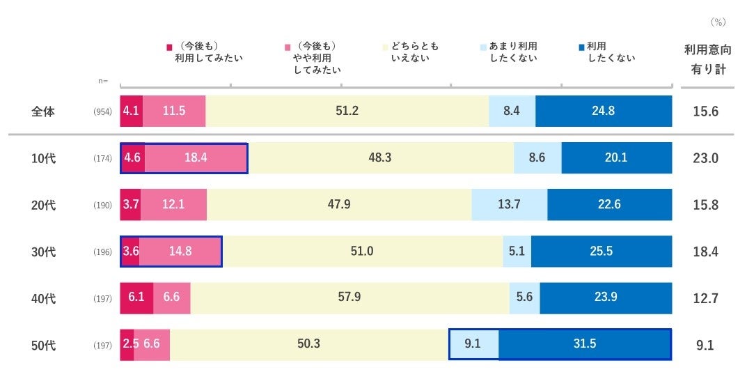 年代別では、「利用意向あり(T2B) 」は10代が23.0%と最も高く、次点は30代で18.4%。「利用意向なし(T2B)」は50代が40.6%、「利用したくない」も31.5%と最も多くなっています。