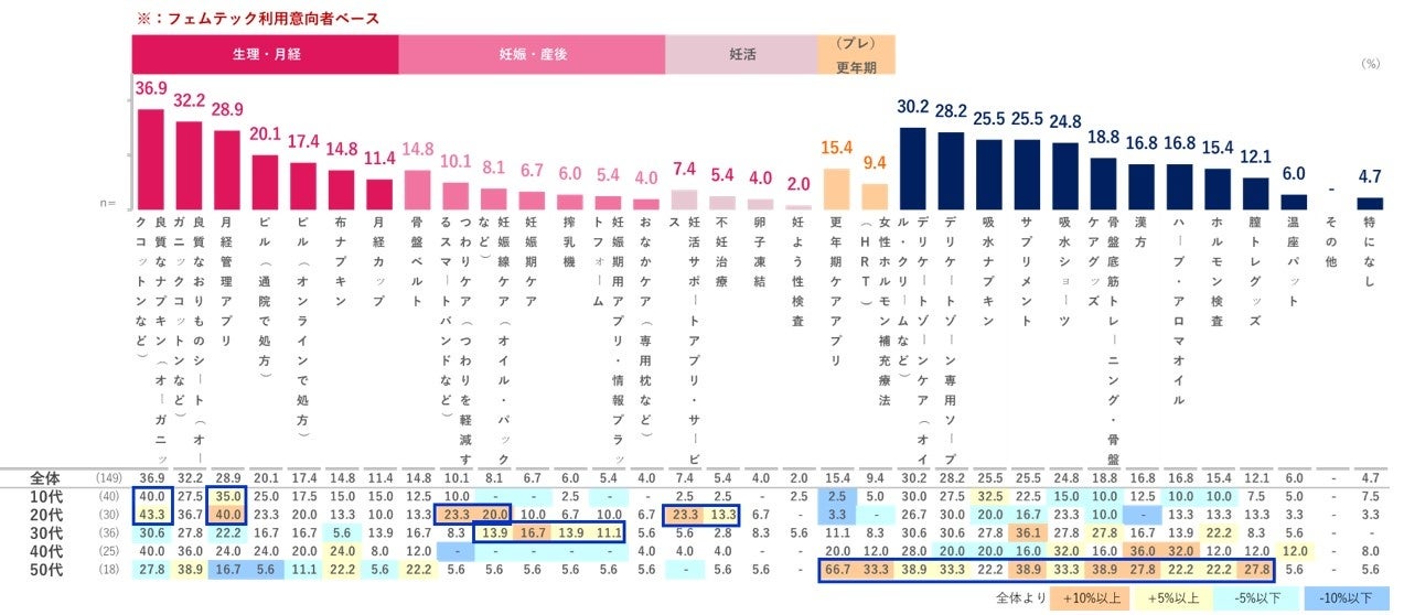 「生理・月経」関連の商品・サービスの利用意向が高い傾向。「良質なナプキン」36.9%が最も多く、「良質なおりものシート」32.2%、「デリケートゾーンケア」30.2%と続く。