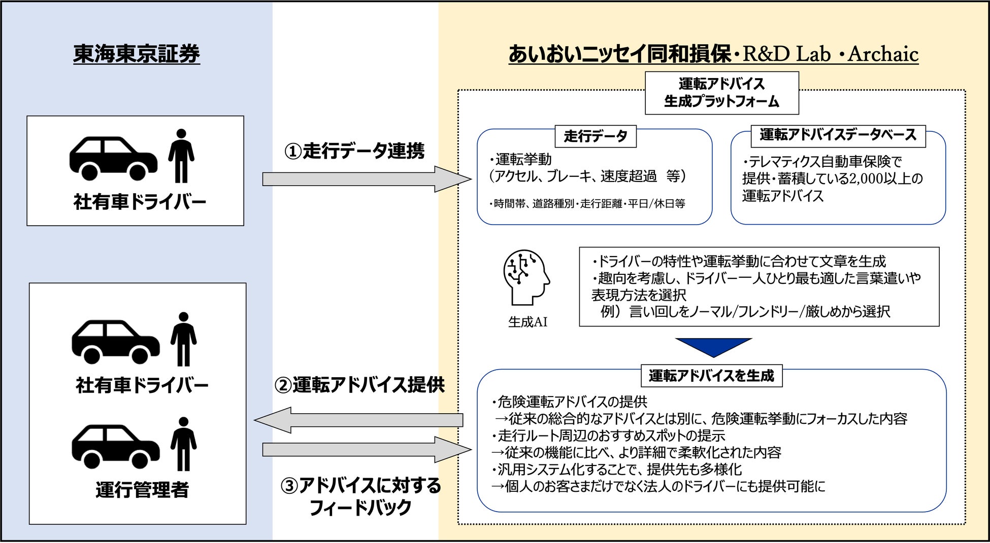 株式会社Archaic(代表取締役社長:横山 智紀)は、MS&ADインシュアランスグループのあいおいニッセイ同和損害保険株式会社(以下「あいおいニッセイ同和損保」)および同社グループ会社のAioi R&D Lab – Oxford(以下「R&D Lab」)とともに、車両の走行データを基に生成AIが安全運転に向けたアドバイスをドライバーごとに作成する「運転アドバイスプラットフォーム」(以下「本システム」)を開発し、2025年11月から東海東京証券株式会社(以下「東海東京証券」)と共同で実証実験を開始します。