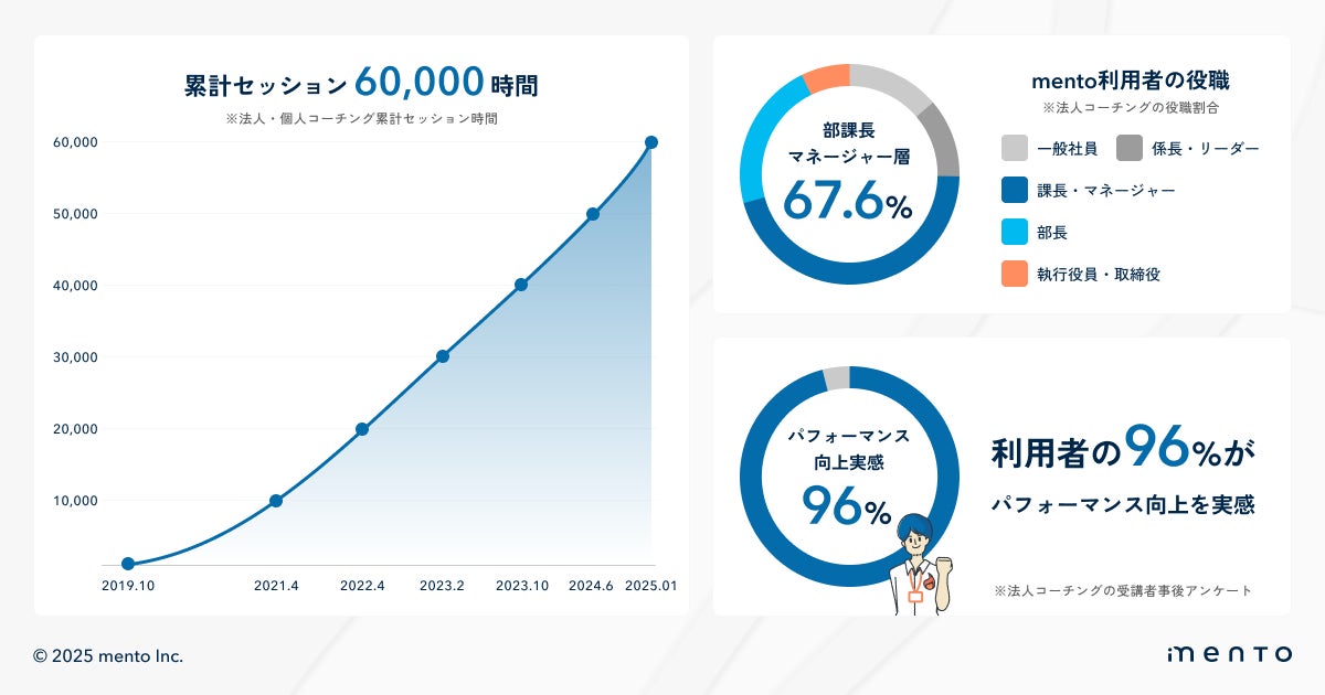 「mento(メント)」は、リーダーの本音を引き出して組織を変える、管理職向けコーチングサービスです。企業の皆様に高品質なコーチングをより手軽に使っていただけるプラットフォームをオンラインで展開しています。これまでに累計60,000時間以上のコーチングを提供しており、登録コーチは約200名にのぼります。2020年のリリース以降、パナソニック、伊藤忠、電通をはじめとする大手企業を中心に導入が広まっています。