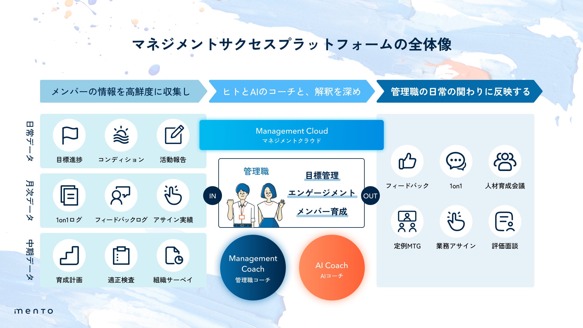 そんななか管理職コーチ「mento」は、現場で奮闘する中間管理職に寄り添い、社外のプロコーチによる1on1のコーチングを提供しています。一人ひとりの悩みや適応課題に対して個別最適なアプローチを提供することで、日本の中間管理職が「育て上手」になり、真のリーダーシップを発揮して組織の熱を高めることを支援してきました。
