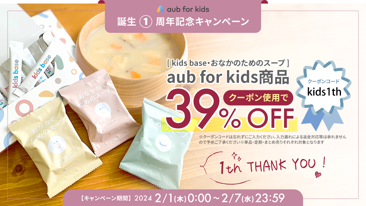 そして、ローンチ1周年の感謝の気持ちを込めまして、2024年2月1日(木)から2月7日(水)までの期間、aub for kidsの全商品(kids base/おなかのためのスープ)が39%OFFとなるお得なクーポンをプレゼントいたします。この機会に、少しでもおこさまのコンディショニングや、家族での腸活に取り組むご家庭が増えることを期待しております!