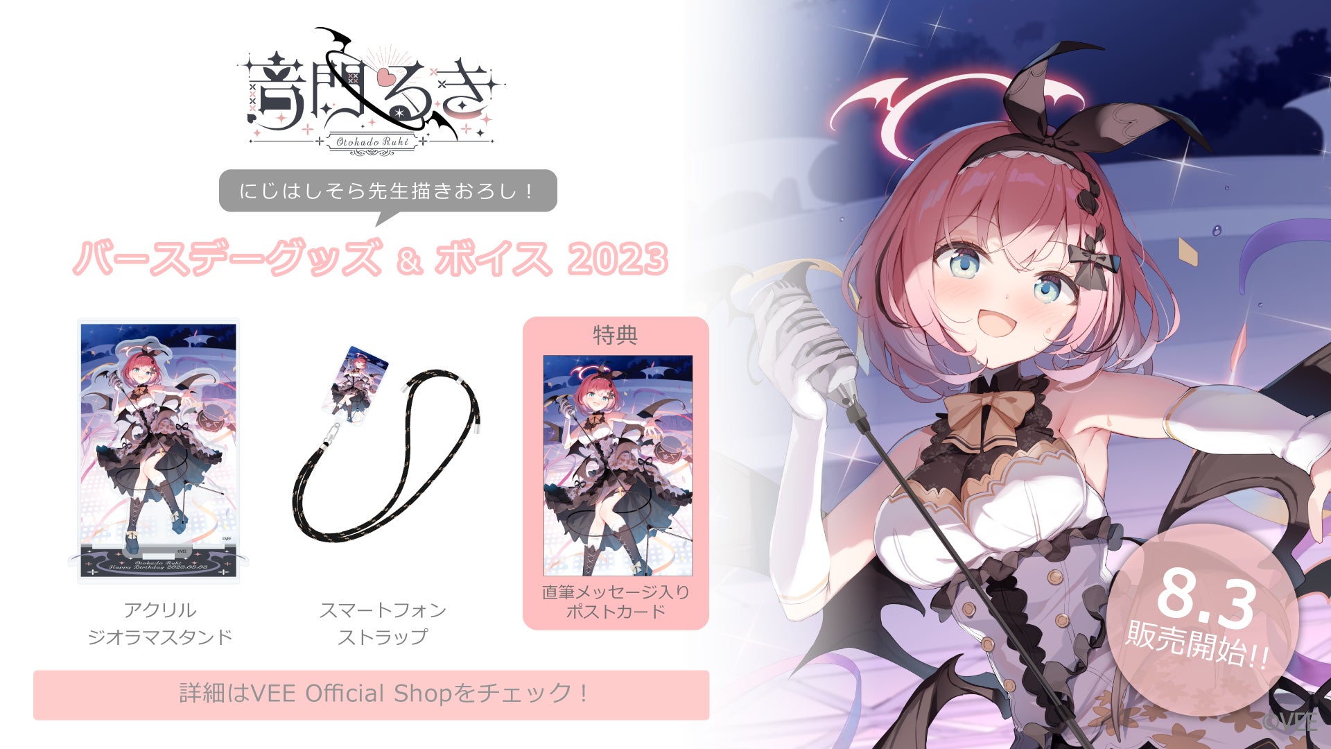 本日・8月3日、誕生日を迎えた音門るきのバースデーグッズの詳細を公開するとともに、公式オンラインショップ「VEE Official Shop」にて受注販売を開始しました。