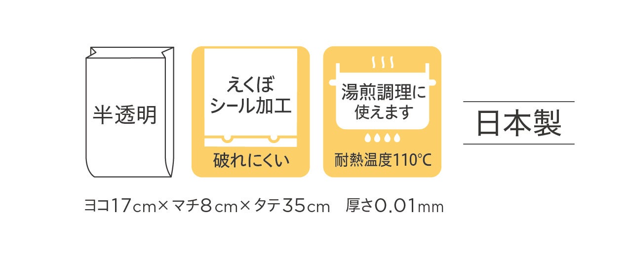 食品保存にも安全な日本製で、機能面では、独自の「えくぼシール」加工により底マチ部を破れにくくしており、湯煎調理(耐熱温度110℃)にも使えます。