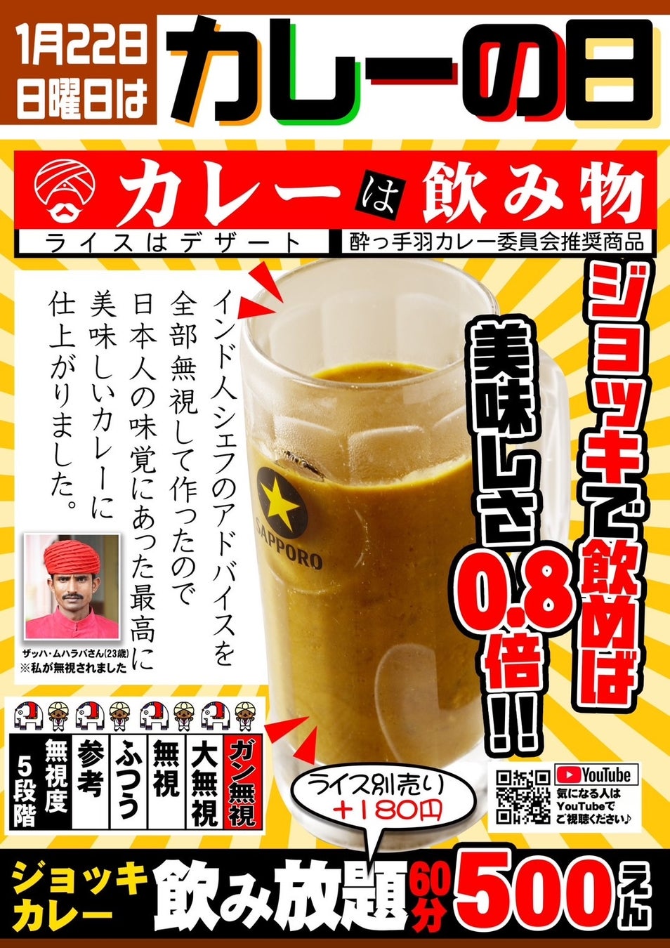 「笑って食べて、笑って飲める」をスローガンとする大衆居酒屋「酔っ手羽」では、1月22日(日)『カレーの日』を記念して、ウガンダ・トラさん※の名言とされる「カレーは飲み物」を具現化して以前好評となった「ジョッキカレー」を飲み放題として販売します。