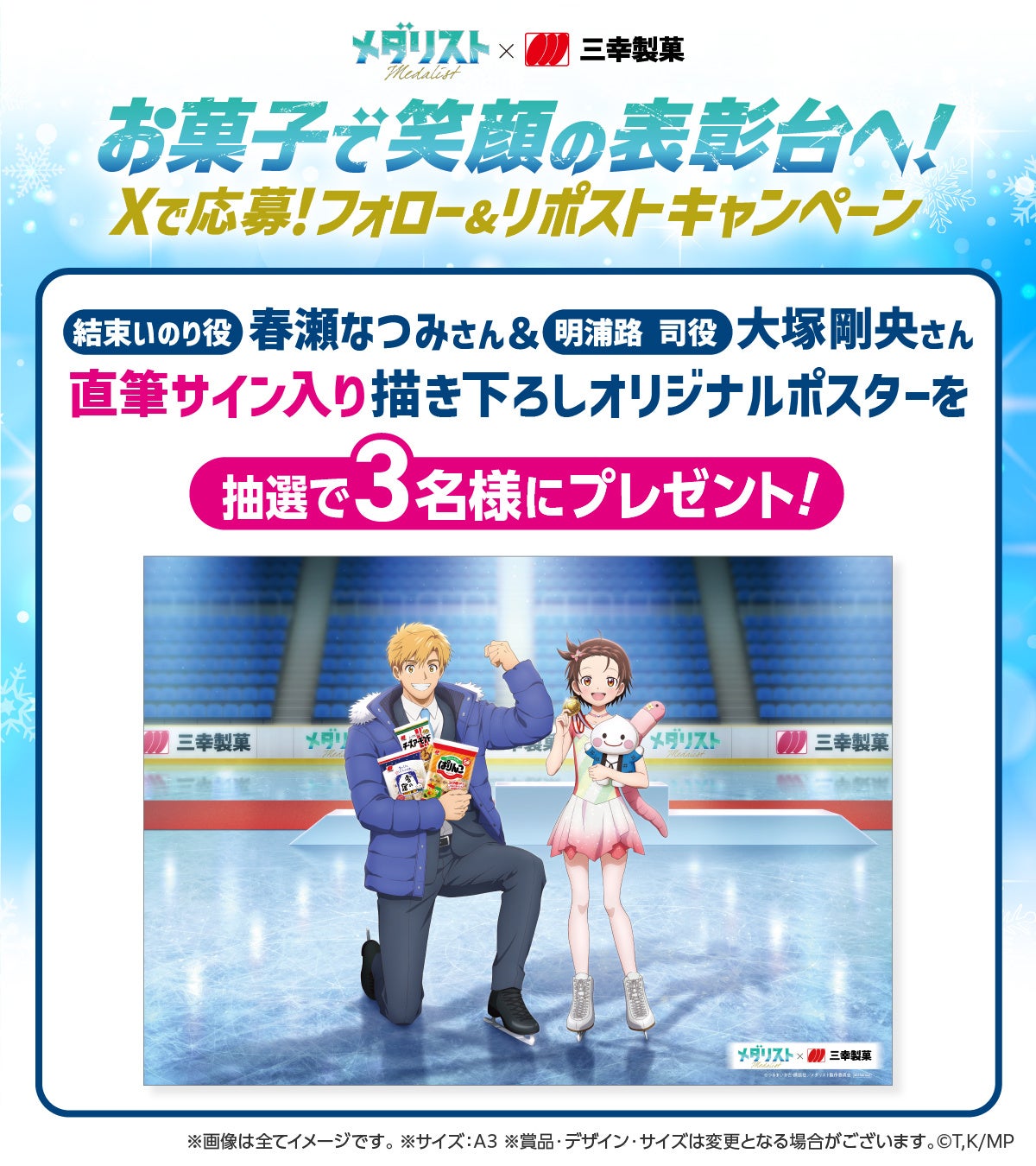 三幸製菓公式X(旧:Twitter)でもTVアニメ『メダリスト』とのコラボキャンペーンを開催いたします。三幸製菓公式X(@sankoseika)をフォローし、本キャンペーンに関する応募対象投稿を応募期間中にリポストして応募すると、抽選で3名様に本キャンペーン限定の「いのり役・春瀬なつみさん&司役・大塚剛央さん直筆サイン入り描き下ろしオリジナルポスター」をプレゼント。
