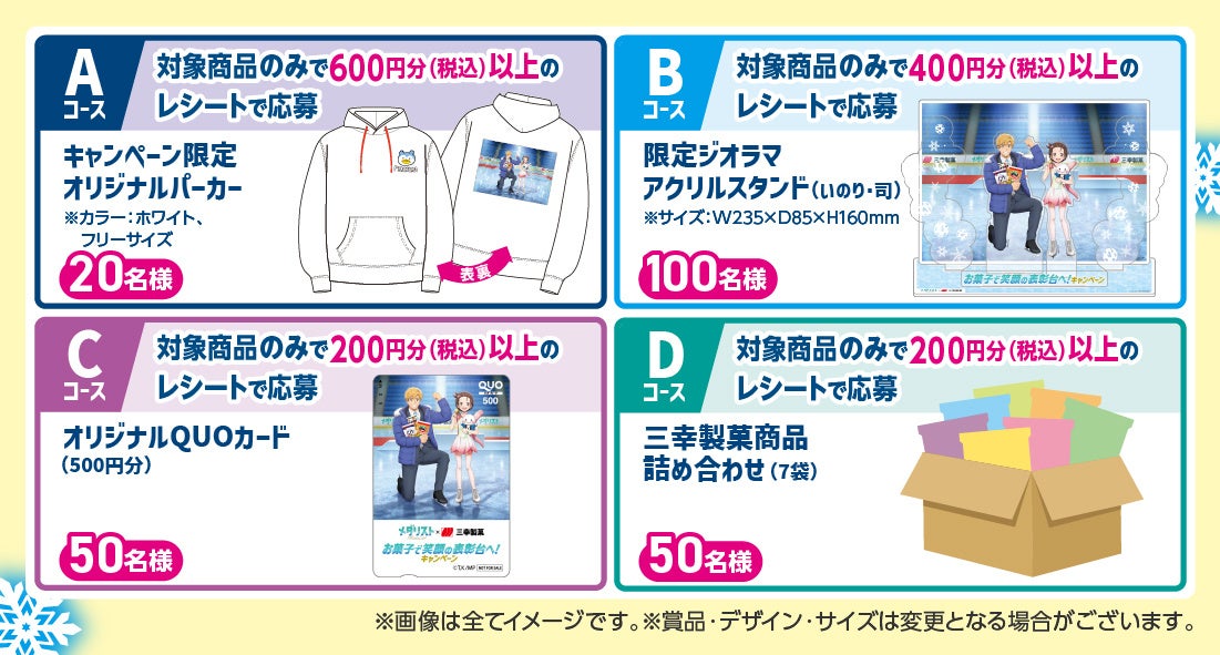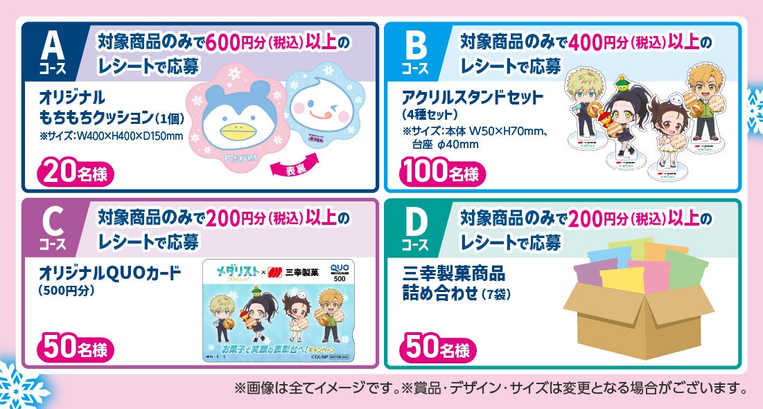 本キャンペーンでは、第1弾・2弾と応募受付期間を2回設けており、それぞれ期間によって抽選で当たるアイテムのラインナップが変化します。コース各種では、本コラボレーション限定の描きおろしイラストを使用したアイテムやTVアニメ『メダリスト』の人気キャラクターと三幸製菓キャラクターズがコラボしたアイテムなど、本キャンペーンオリジナルグッズをご用意。第1弾・2弾の「応募受付期間」、「対象となるレシート有効期間」、「応募締め切り」をご確認のうえ、ご応募ください。