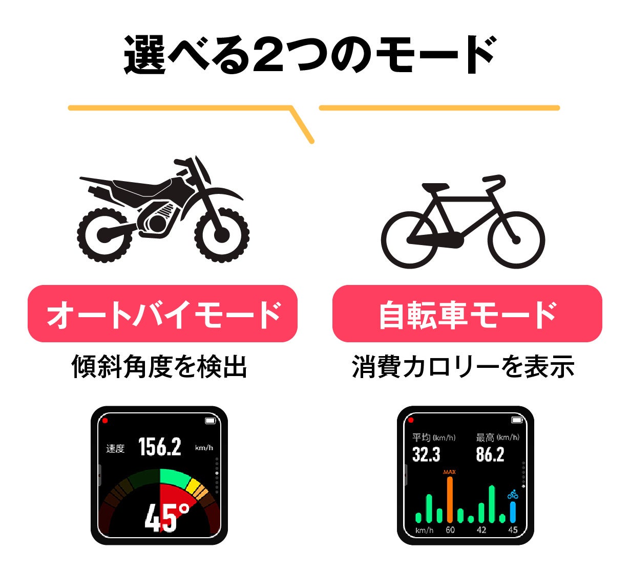 データを記録し表示するモードには、オートバイモードと自転車モードがあります。オートバイモードではバイクの傾斜角度を検出する機能があり、自転車モードでは走行時の消費カロリーがわかります。