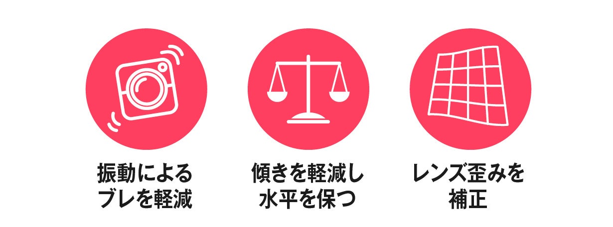 また、カメラが傾いた際に映像の地平線を水平に保つ機能が備わっており、バイクや自転車などの移動中にカメラが傾きやすい状況にも対応します。