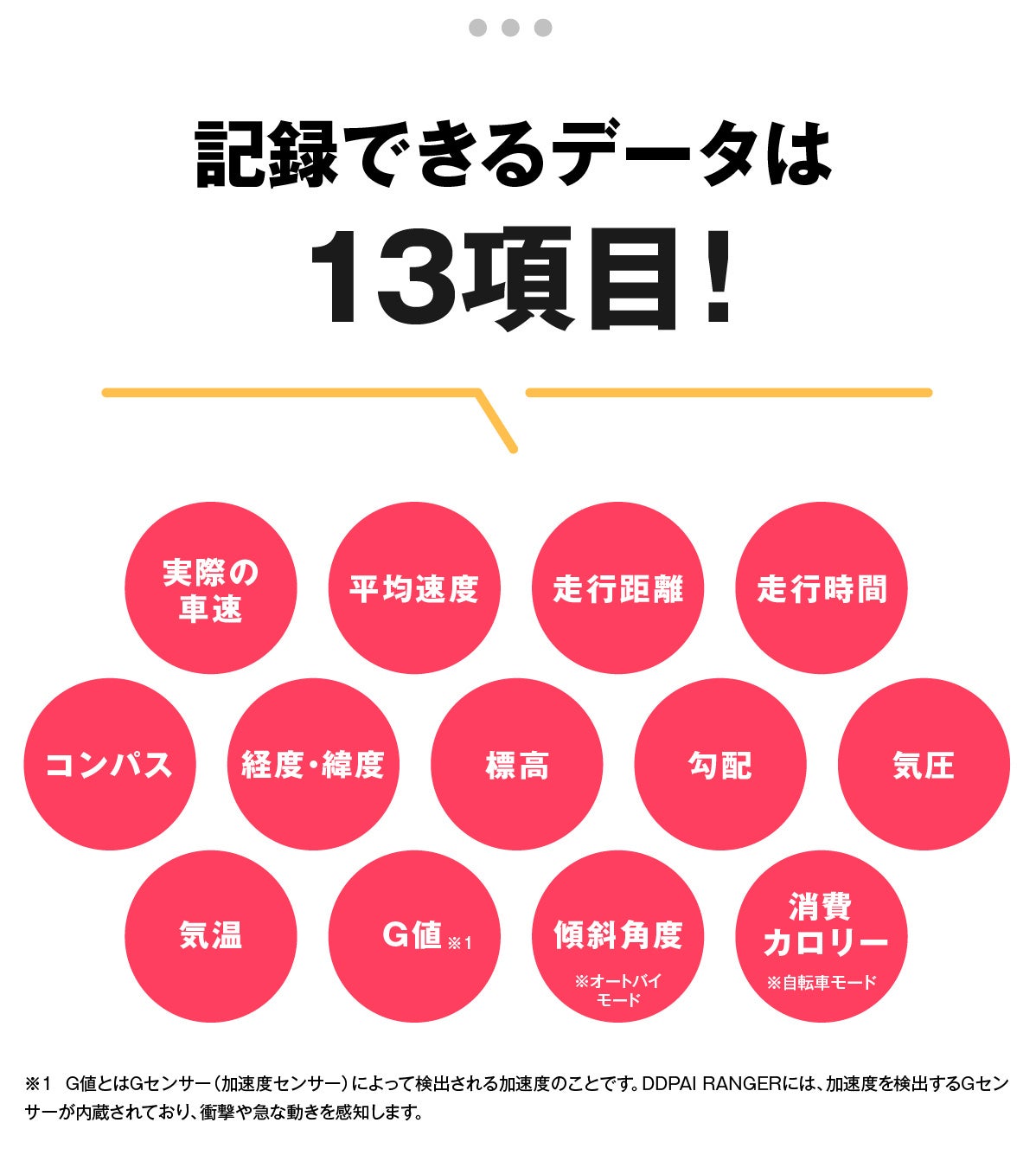 DDPAI RANGERが記録できるデータの項目はなんと、13項目!走行中のあらゆるデータをリアルタイムで表示・記録します。