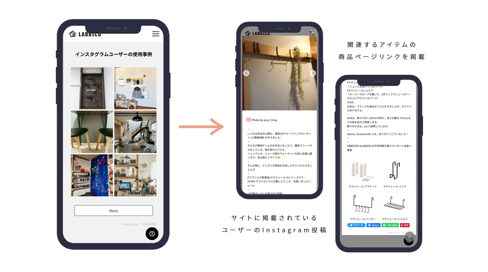 ラブリコではvisumoを利用することで、インスタグラムコンテンツ(ビジュアル)をきっかけにユーザーの興味をひき、そこからより商品について知っていただくような新しい商品ページへの導線を実現しています。