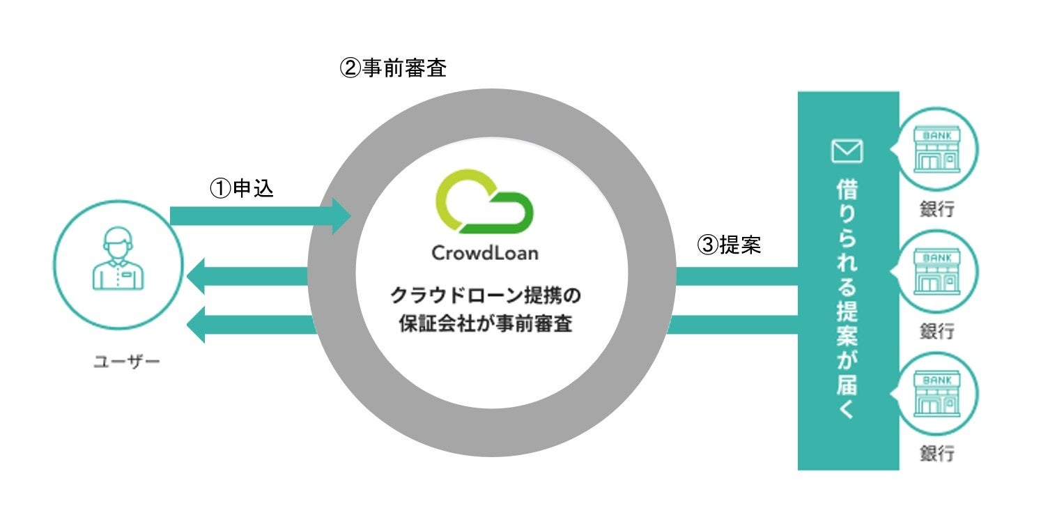 クラウドローンは、貸し手である銀行と借り手である個人を、オンラインでつなぐマッチングプラットフォームです。提携の銀行保証会社において事前審査を行うことで、自身にピッタリの銀行ローン選びができる国内初のサービスです。
