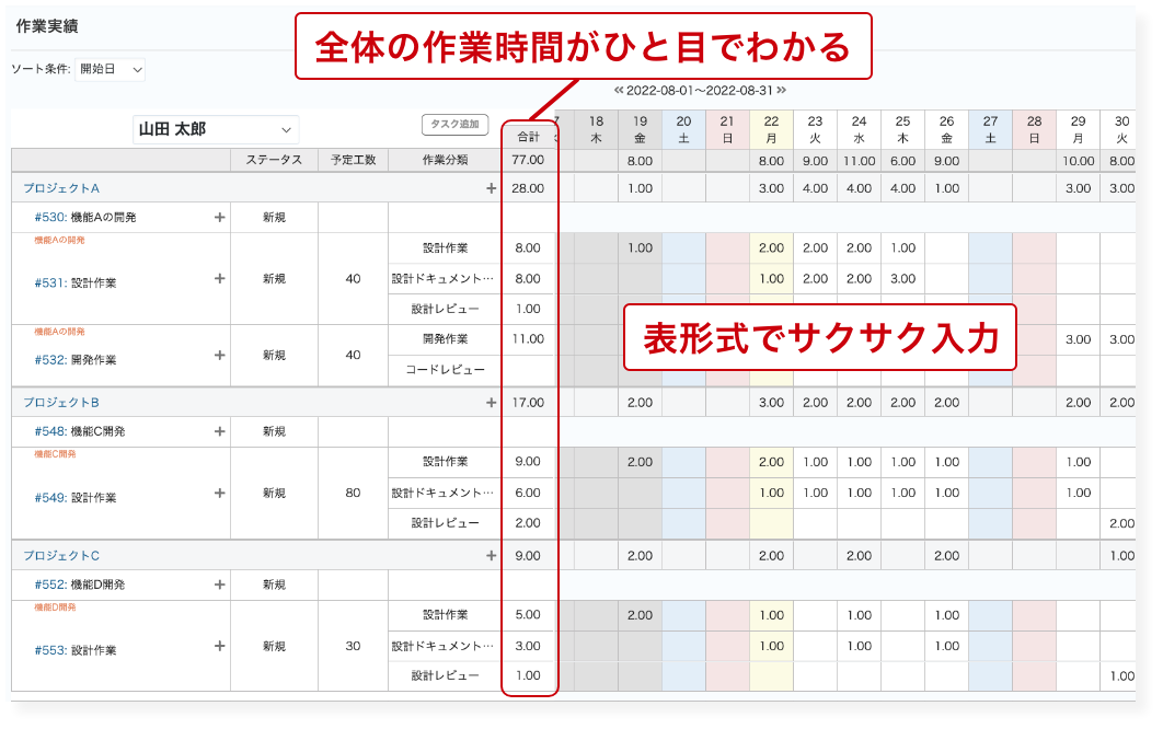 プロジェクト毎の作業時間や合計もひとまとめでわかるので、全体を通して作業時間を管理しやすくなります。