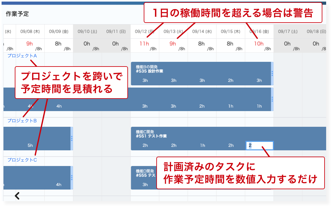 マネージャーから割り当てられたタスクに対して、作業者自身が作業時間を見積もることで、無理な計画を事前に察知し、早い段階での適切な計画見直しを可能にします。