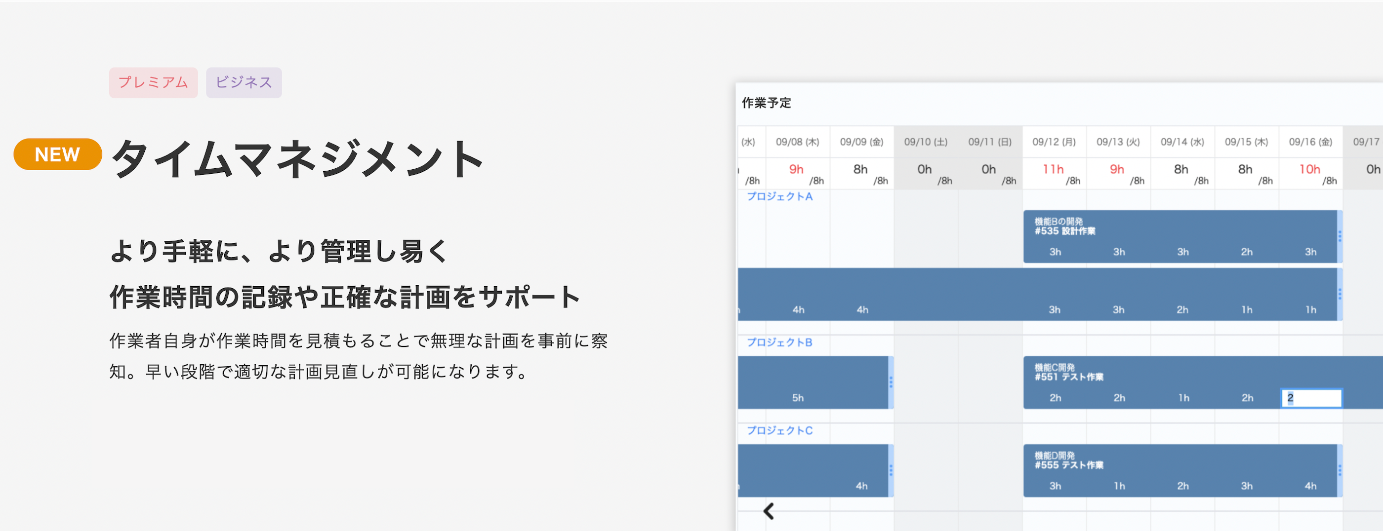 新「タイムマネジメント」では、作業者自身が作業時間を見積もることで無理な計画を事前に察知できるようになり、早い段階で適切な計画見直しが可能になります。この機能により、プロジェクトの円滑な進行を強力にバックアップします。