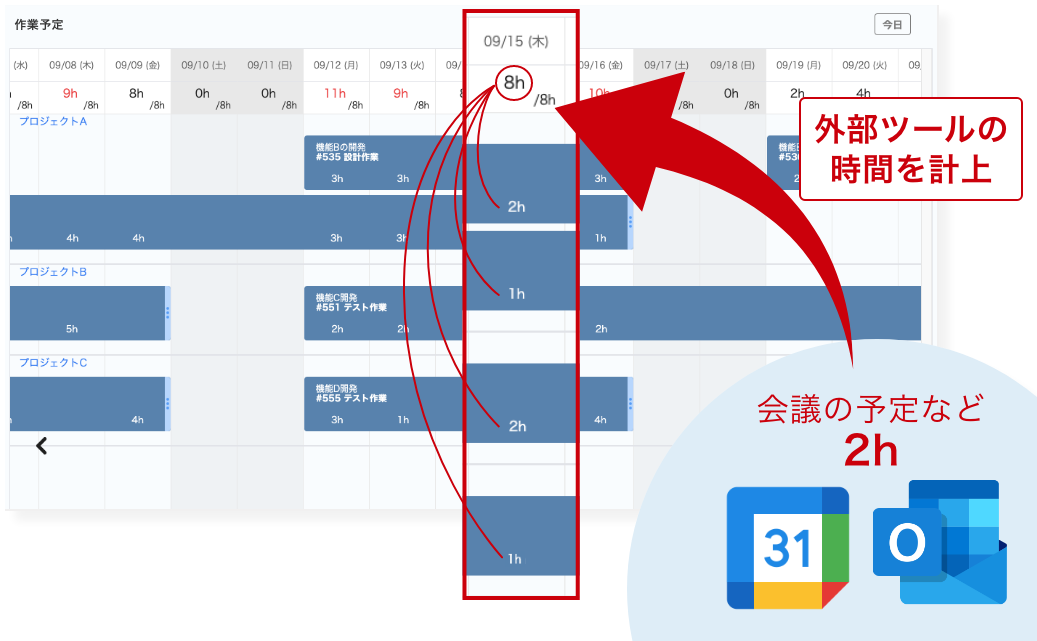 OutlookやGoogleカレンダーの予定を作業時間として加算します。会議時間などを考慮して、更に正確な作業予定を立てることができます。