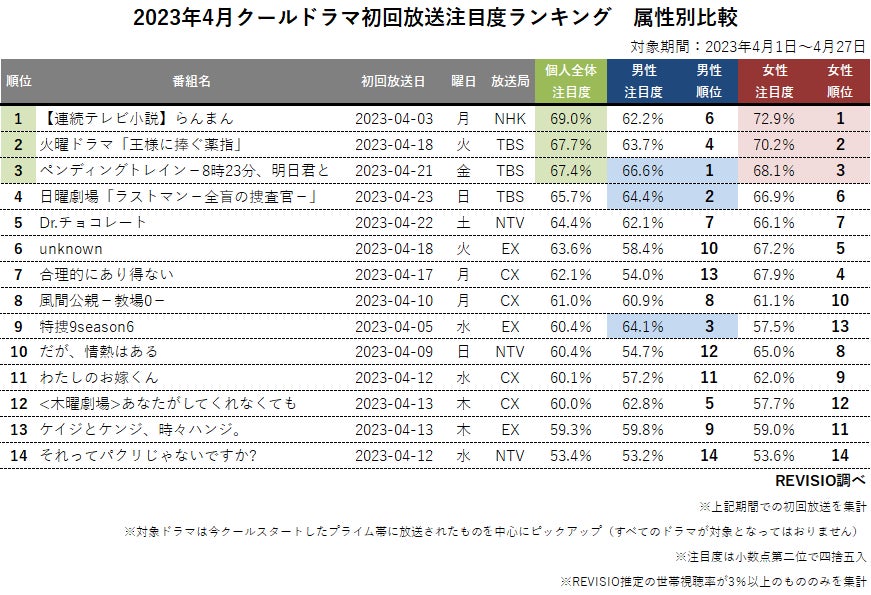 4月からスタートした、春ドラマで主にプライム帯に放送されているドラマをピックアップし*、REVISIO独自の注目度という指標によって初回放送の「注目度ランキング」を作成いたしました。その結果、個人全体と女性の1位から3位が同じランキングとなりました。また、1位の朝の連ドラを除くと、上位3作品はTBSの独占でした。女性より男性が釘付けになったドラマは14作品中3作品のみで、女性のほうがドラマを集中してみているということが分かりました。