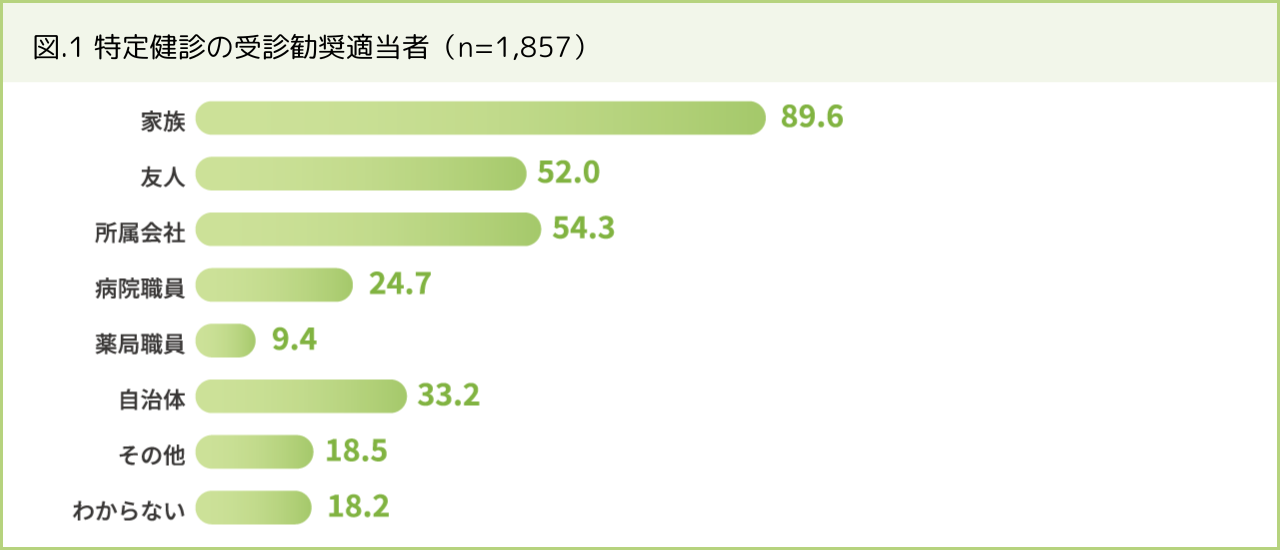 次に、「特定健診の対象者へ受診を勧めるのに適当と思う者」の質問では、「家族」の回答が89.6%(1,664人)と最も高く、「所属会社」54.3%(1,009人)、「友人」52.0%(966人)と続き、「薬局職員」は9.4%(175人)と最も低く、一般的には薬局は特定健診の勧奨を受ける場として想起されにくいことが分かりました(図1)。