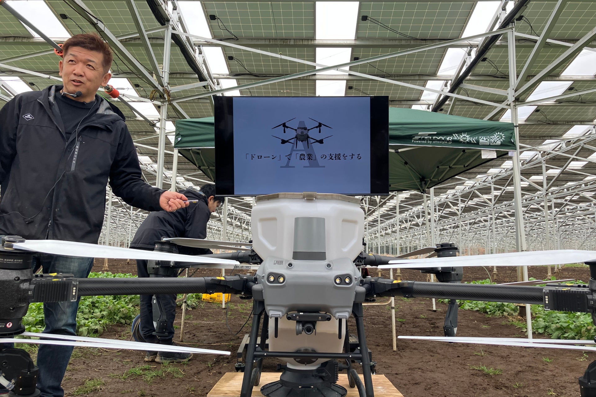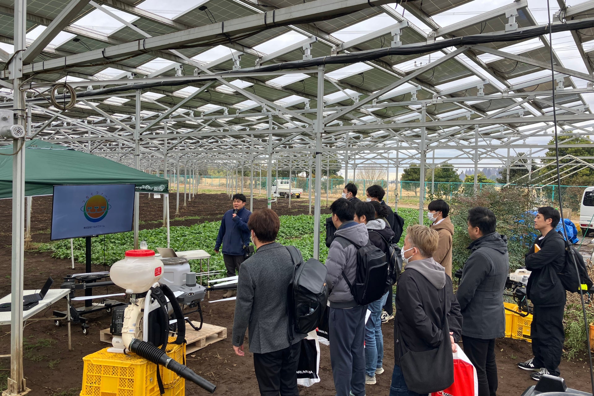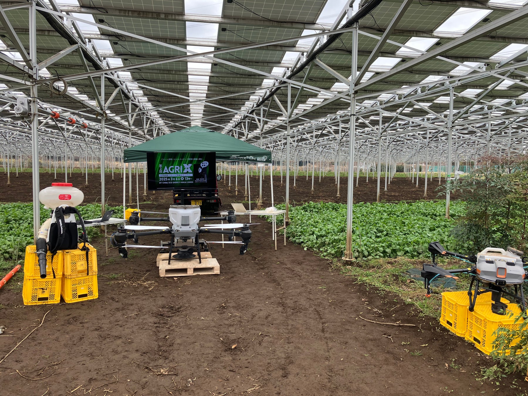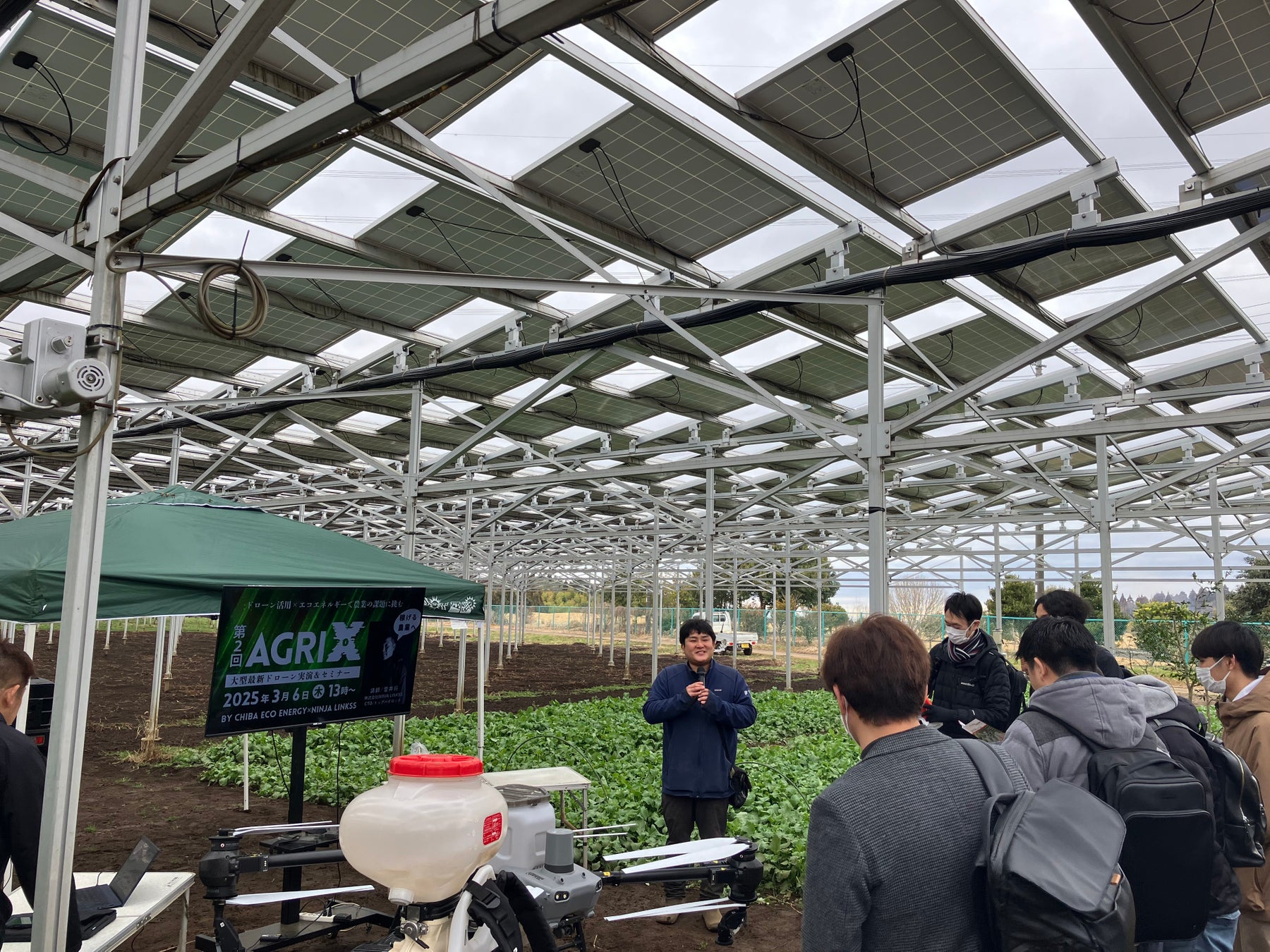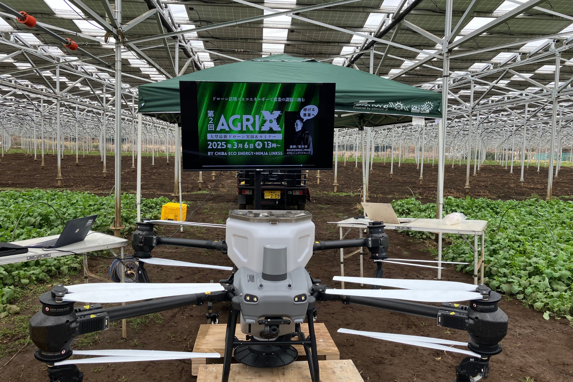 千葉大学発のベンチャー企業である千葉エコ・エネルギー株式会社(本社:千葉県千葉市、代表取締役:馬上丈司)のグループ会社であり、営農型太陽光発電やスマート農業など持続可能な農業を実践する株式会社つなぐファーム(本社:千葉県千葉市、代表取締役:蘒𠩤領)は、3/6に当グループの農場(千葉県千葉市)にて最新の農業用ドローンの機体の展示やデモンストレーションを行うイベント「第2回AGRI X」を開催しました。本イベントは、2024年12月に滋賀県で開催された「第1回Agei X」のムーブメントを千葉県にも広げるべく、千葉エコ・エネルギー株式会社のパートナーである株式会社 NINJA LINKSS様の協力のもと実現しました。