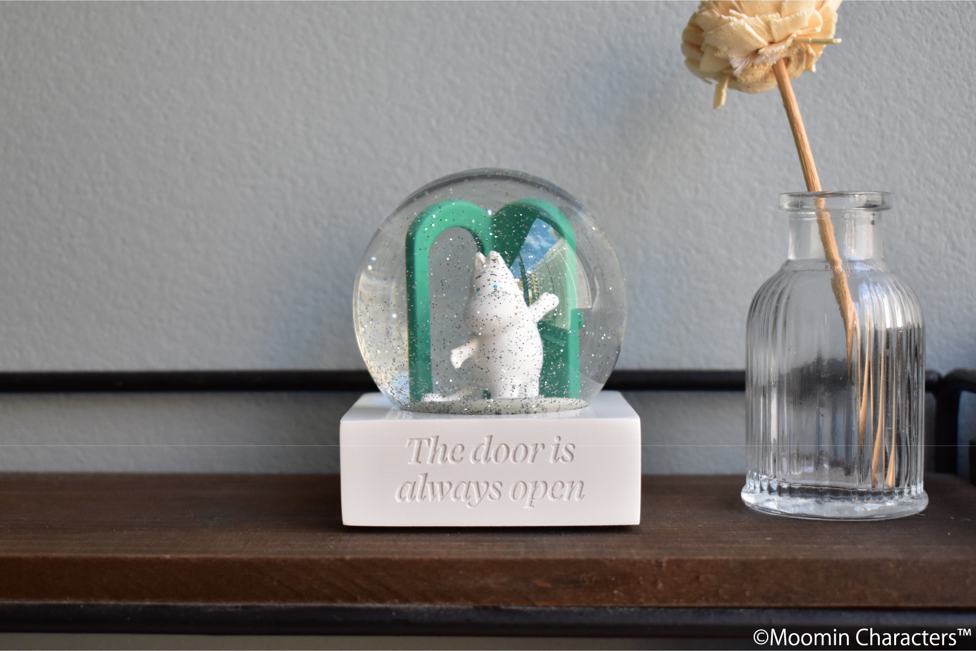 ムーミン80周年を記念したスノードーム。ドアから手を差し伸べるムーミンのアートが立体的に再現されており、ドーム内で雪のようにキラキラと舞うグリッターが美しいアイテムです。台座にはムーミン80周年のテーマである「The door is always open」が刻まれていて、記念の年にふさわしい特別感ある仕上がりです。