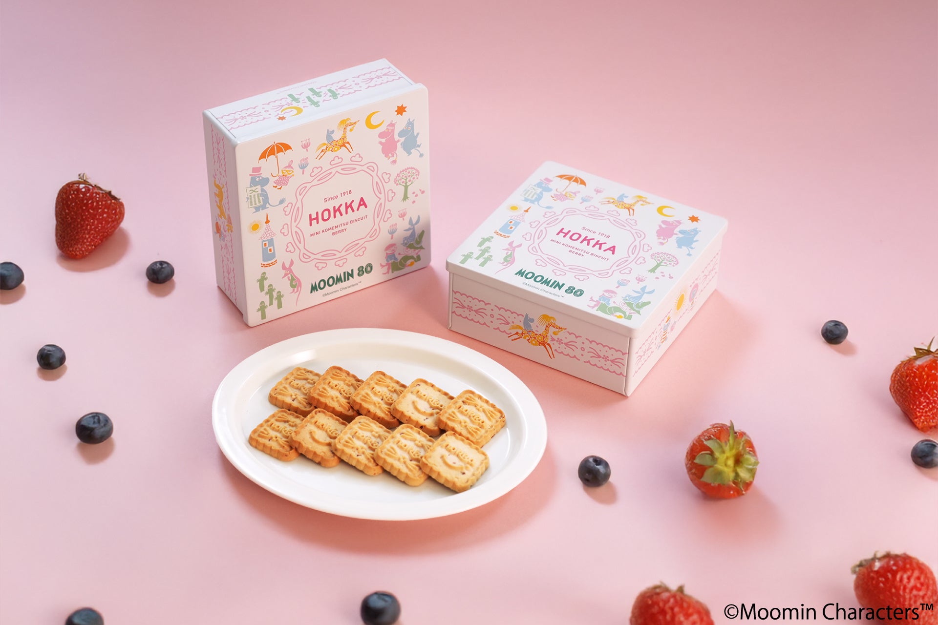 自然派ビスケット「米蜜ビスケット」シリーズが、ムーミン80周年を記念して特別なフレーバーで登場。北欧やムーミンをイメージしたミックスベリー味にアレンジされていて、ベリーのほどよい酸味とドライフルーツの食感がアクセントになった食べ応えのある一品です。限定デザインの缶には、80周年のロゴと「Play/Stripes」シリーズのアートがあしらわれており、記念アイテムとしての特別感を引き立てます。食べ終わった後も缶を小物入れなどにアフターユースできる点も魅力です。