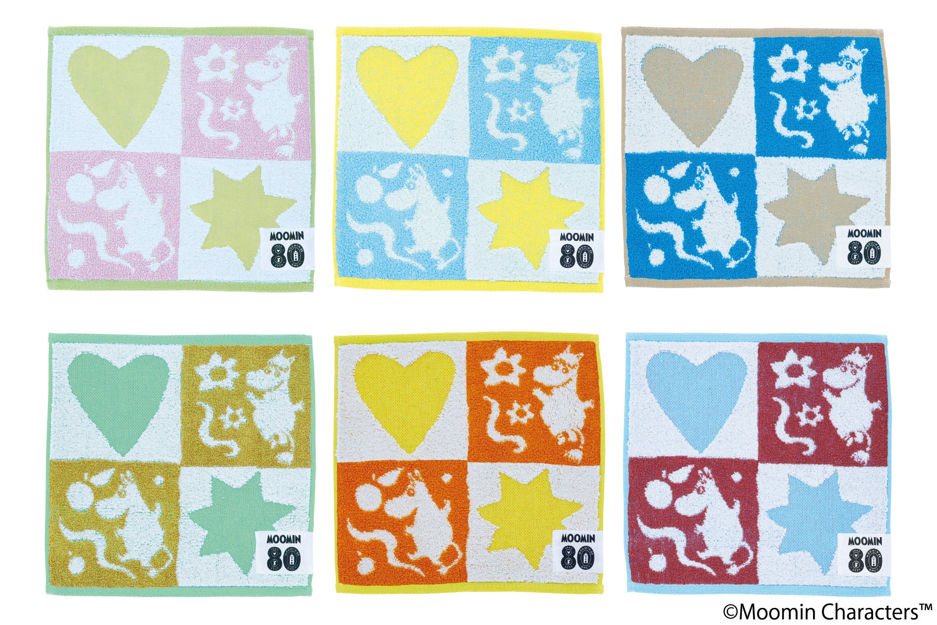 ムーミン80周年を記念した「Play/Squares」デザインのミニタオルです。80周年ロゴのタグ付きで、アニバーサリーアイテムらしい雰囲気です。全6パターンの異なるカラーバリエーションがそれぞれの魅力を引き立て、気分やシーンに合わせて選ぶ楽しみが広がります。日常使いにはもちろんギフトにもおすすめ。ムーミンの80周年を身近に感じることができます。