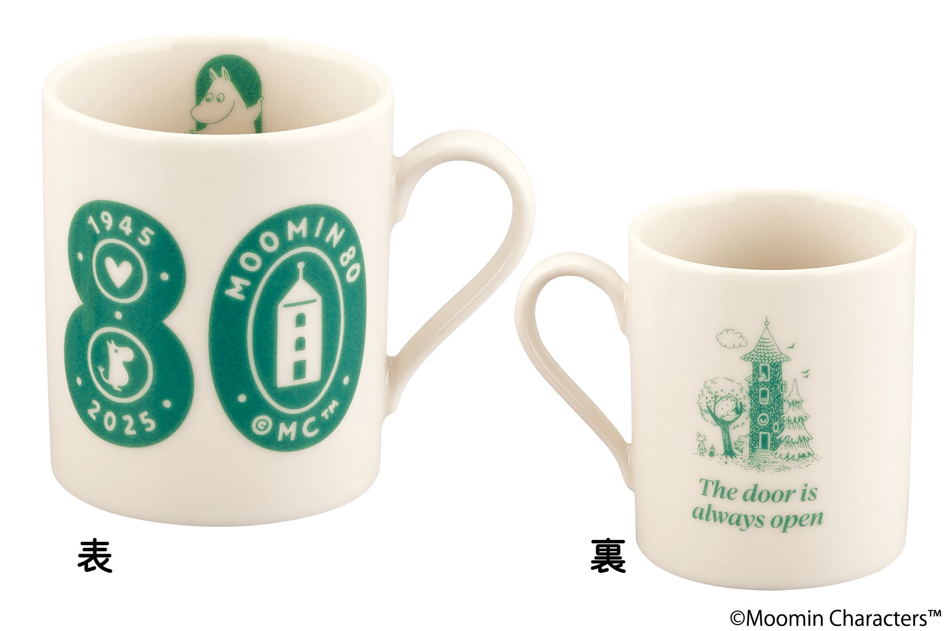 ムーミンの80周年を記念した特別なマグカップです。表面には80周年を象徴するロゴが大きくデザインされ、裏面には80周年のテーマである「The door is always open」というメッセージが刻まれています。また、そのテーマを象徴する「ムーミンやしき」のアートが描かれ、ムーミンの世界観を存分に楽しめる一品です。日常使いはもちろん、80周年記念としても特別感のあるアイテムとなっています。