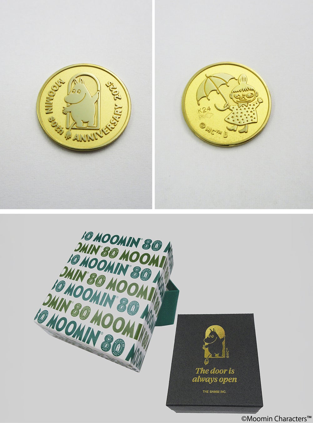 ムーミン80周年を記念して、特別に製作された純金メダルが登場します。表面はムーミン、裏面はリトルミイが精巧に刻まれています。ロゴとメインアートをあしらったボックス入り。美しいデザインと純金ならではの重厚感は、特別な記念品としても、ご自身へのご褒美としてもおすすめです。