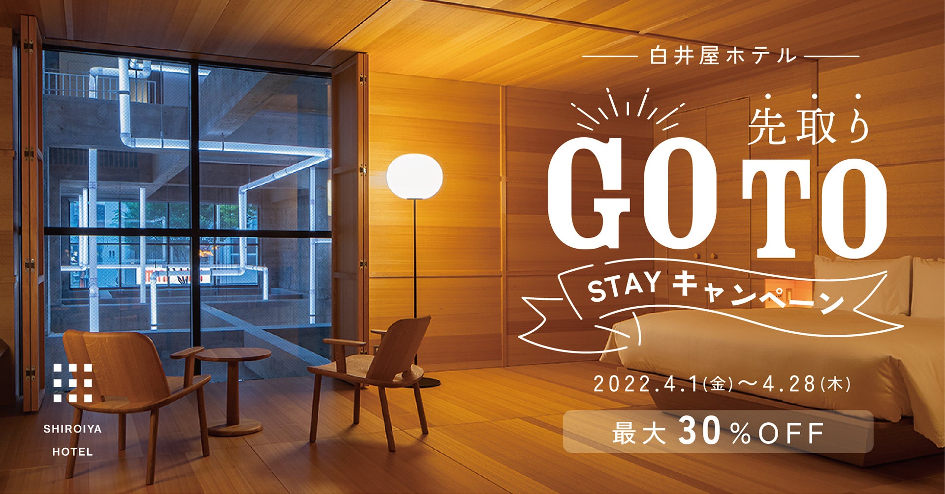 前橋のアートデスティネーション「白井屋ホテル」を運営する白井屋ホテル株式会社(群馬県前橋市本町、代表取締役:矢村功)は、来るべきGO TO キャンペーンの先取りとして「白井屋GO TO先取りSTAYキャンペーン」と題したお得な宿泊プランを2022年4月1日(金)から開始します。最大室料30%OFF、特典付きの宿泊キャンペーンは、GO TO キャンペーンが始まるまで実施します。