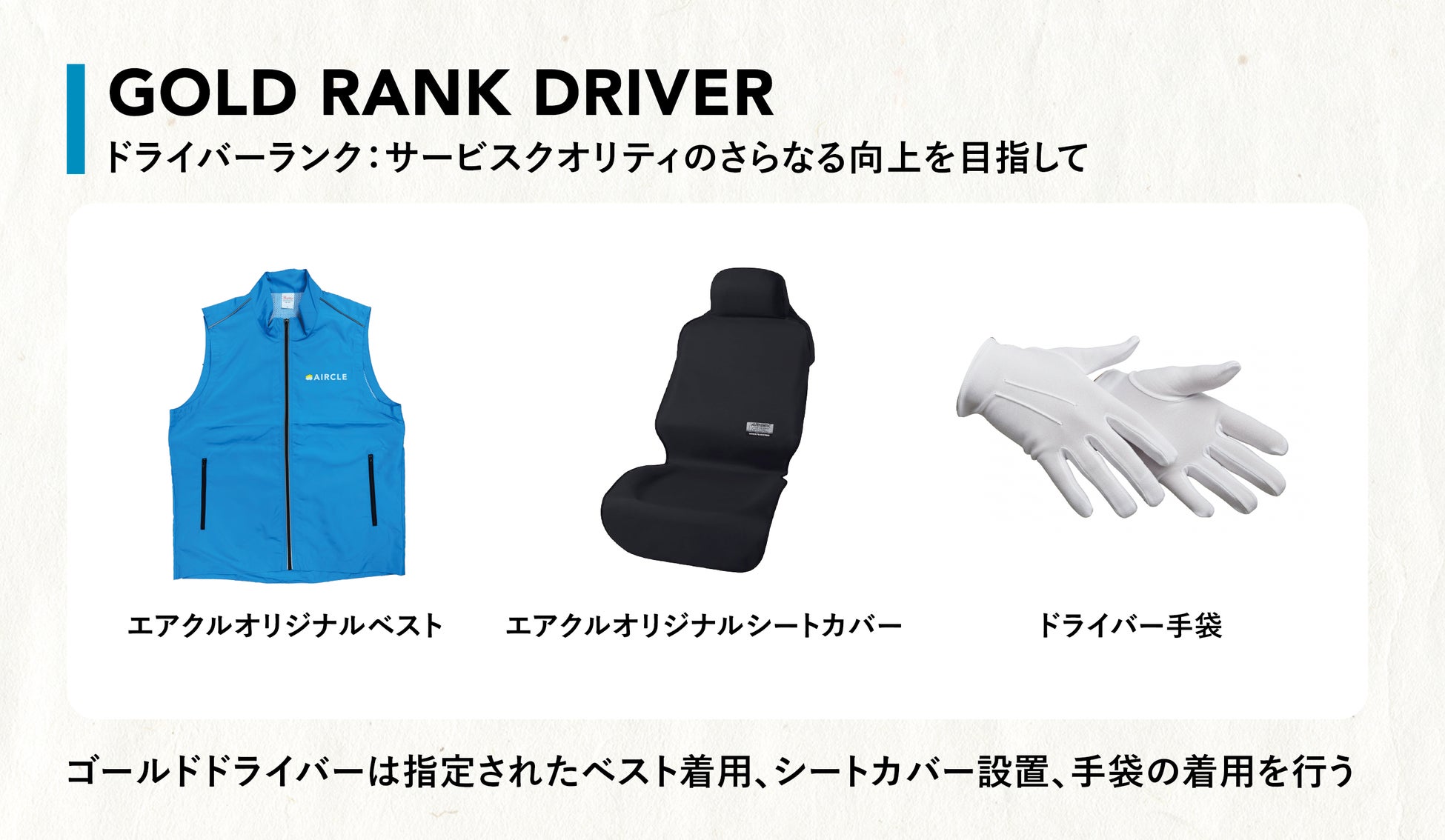 また、ゴールドランクのドライバーには、エアクルとして「制服、シートカバー、手袋」を配布いたします。ユーザーのみなさまに快適な運転代行サービスを提供できるよう、品質向上を目指して取り組んでまいります。