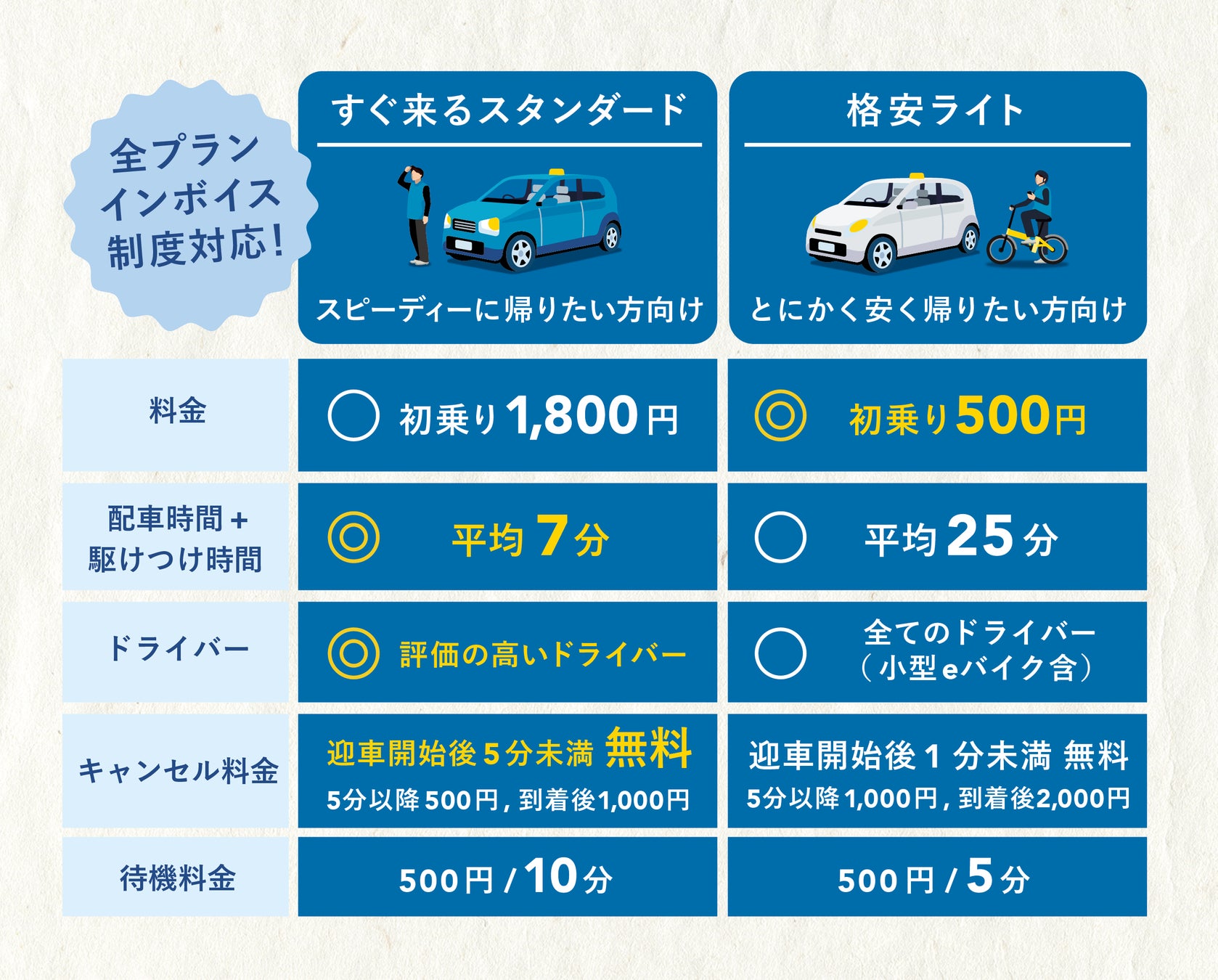 この度は「すぐ来るスタンダード」プランと、初乗り500円を実現した「格安ライト」プランをご用意しました。2プランともにインボイス制度に対応するほか、審査基準は従来通りとして安心・安全に使って頂けます。それぞれの目的やご予算、利用シーンに応じて使い分けていただくことで、より運転代行が利用しやすくなります。